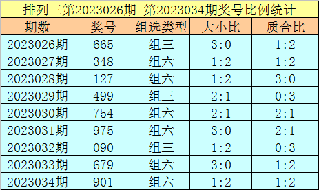 上期回归:摆列三第2023034奖号开出901,奖号质合比为1:2,大小比为1:2,跨度为9,类型为组六。