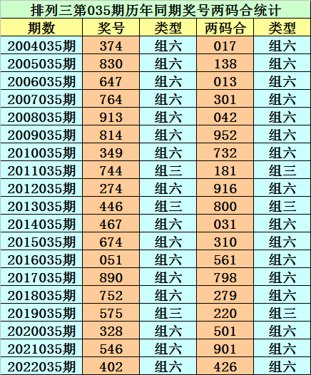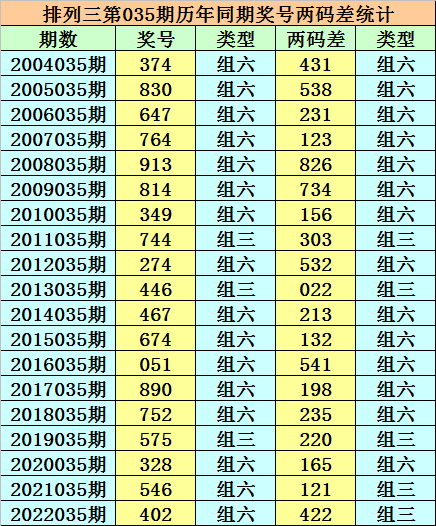 成列三从2004年开奖于今已开出6455期奖号了,其中第035期历史同时奖号出现19次,积年第035期辩认开出号码:374、830、647、764、913、814、349、744、274、446、467、674、051、890、752、575、328、546、402。