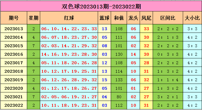 红三区【23-33】上期开出2个红球23、31,近10期出号23个走势相对较热;近50期该区开95个,低于平均值;关怀本区号码平出,展望本区开出2个24、33,三区比参考2:2:2。